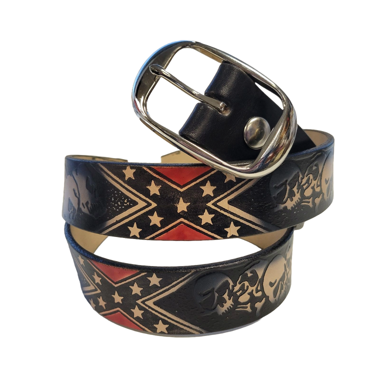 Bring some fire to your waistline with the rebel flag and skulls embossed leather belt — authentic cowhide with a design that tells your story. This belt blends symbolism with strong construction to deliver something that’s more than just a strip of leather.